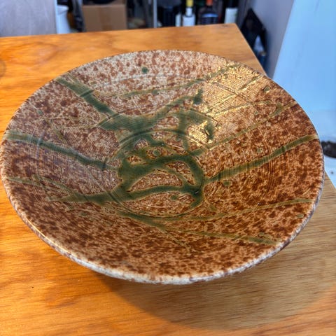 Keramik skål/fad med detaljeret reliefmønster i brun og beige nuancer. Skålen har en rund form og en rustik overflade med kunstneriske figurer og motiver. Velegnet til dekoration eller som en unik serveringsskål. Diameter 41 cm