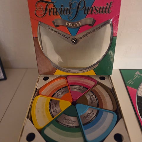 Trivial Pursuit 2000 brætspil med spilleplade, spillekort og spillebrikker i forskellige farver. Spillet er designet til 16+ år og indeholder spørgsmål inden for forskellige kategorier. Indeholder spillevejledning og alt nødvendigt tilbehør til at spille spillet.