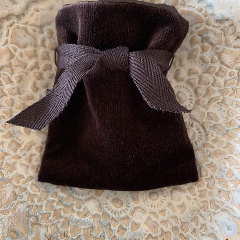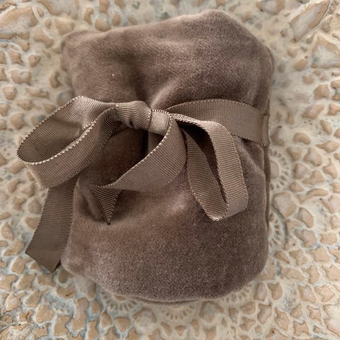 Ole lynggaard smykkeposer i brun velour med silkebånd med sølvhjerter og pingviner