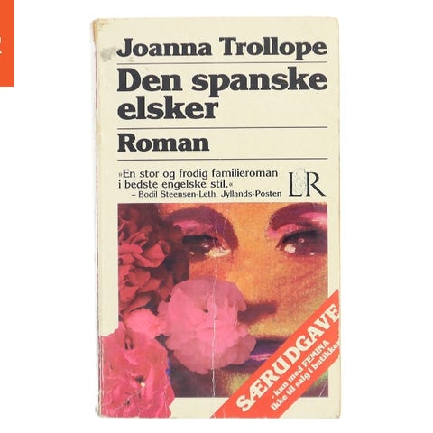 Den spanske elsker, Joanna Trollope, genre: roman, Indbundet bog med smudsomslag, der er skrevet navn foran i bogen.
