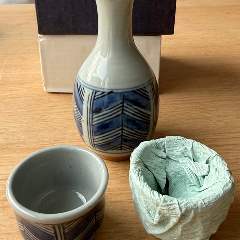 Japansk sake flaske med flotte motiver med tilhørende kop fra sakebryggeri i Okayama, Japan. Flasken er uåbnet, dog forventer jeg ikke at indholdet kan drikkes, da sake ikke kan opbevares i mange år.