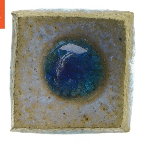 dekorationsornament lavet af keramik med en blå, revnet glasur og røde detaljer. Ornamentet har en unik spiralformet bund og er håndlavet med tydelige teksturer og farvevariationer. Velegnet til indretning og samling af dekorative objekter.