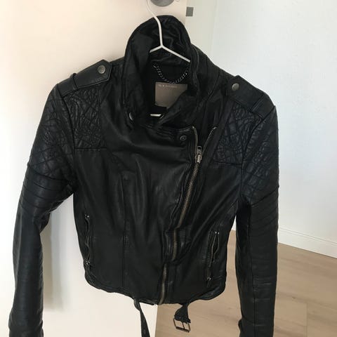 Læderfrakke, str. 36, mærket Muus, mørkebrun, længde 114, normal i størrelsen