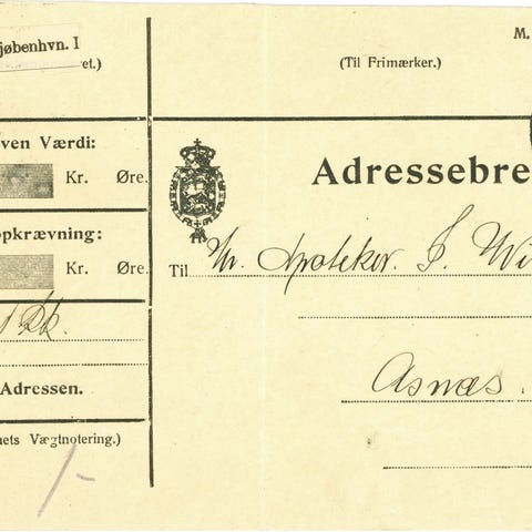 Adressebrev for pakke sendt fra Kjøbenhavn 23.5.1916 til Mogens Nielsen, Høve pr. Asnæs. Postopkrævning på 19,50 kr. Ankomststempel Asnæs 24.5.1916.