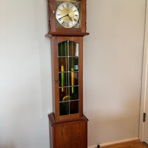 8-dages værk, drevet af to originale blylodder og et messing pendul. Slår timerne.