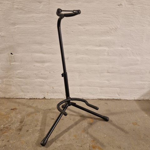Sort guitartstativ til salg. Standardstørrelse, der passer til guitarer i fuld størrelse. Gummitop til at sikre guitaren. Kan justeres.