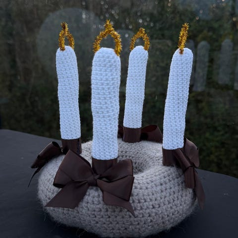 Helt ny, hjemmehæklet julekrans med sløjfe. Ringen måler 25 cm i diameter. Hæklet i 100% bomuldsgarn og akrylgarn af høj kvalitet.
