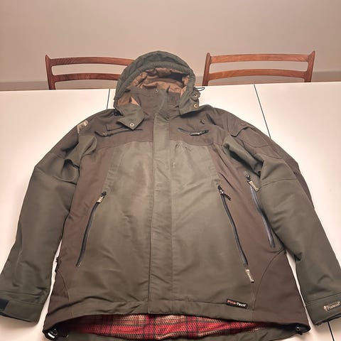 Anderson Geoff jakke og bukser sæt i brun farve. Jakken har flere lommer med lukninger, lynlås og knapper, samt justerbare funktioner ved ærmer og bund. Bukserne har justerbare stropper og forstærkede knæområder. Sættet er designet til jagt og fiskeri. Størrelse M. Kan bruges hele året rundt.Bedste kvalitet på markedet. Vind og vandtæt.