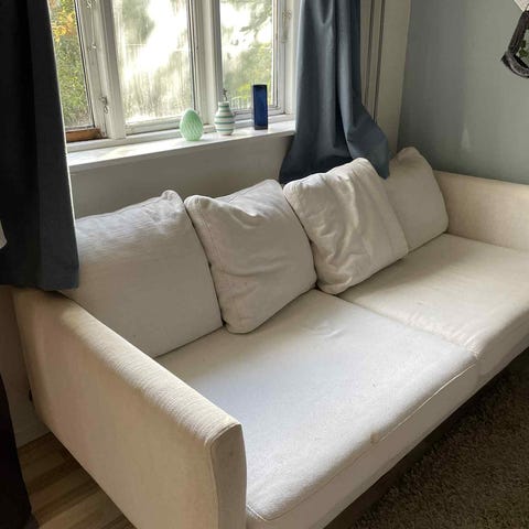 Hvid sofa med armlæn, betrukket med lyst stof. Sofaen har en enkel og moderne design med en fast ryg og sæde, egnet til opholdsstue eller kontor. Sofaen har ben i mørkt materiale og en bredde, der passer til to til tre personer.