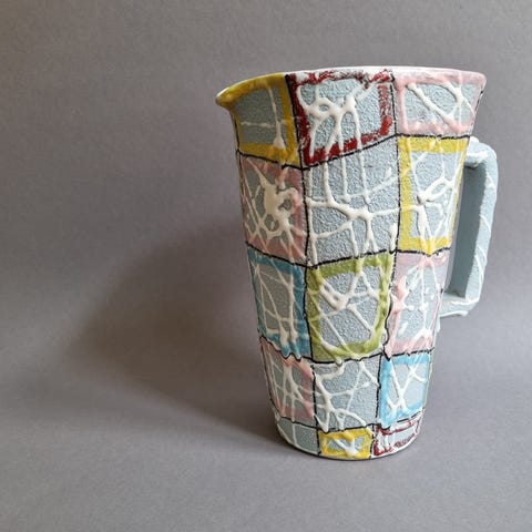 Denne keramikkande blev fremstillet i Italien i midten af det 20. århundrede, sandsynligvis i 1960’erne, af Fratelli Fanciullacci, en anerkendt italiensk keramikproducent kendt for sine karakteristiske modernistiske designs. Kanden har en tekstureret overflade med farverige geometriske mønstre, typiske for den Mid-Century Modern-stil, der var populær i denne periode.