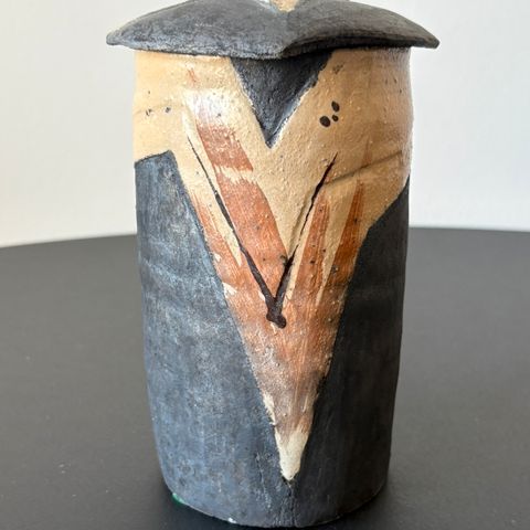 Spændende lågkrukke med hanke, unik, stentøj fremstillet af kunstneren Ester Gedde Højland på eget værksted. I meget fin stand.