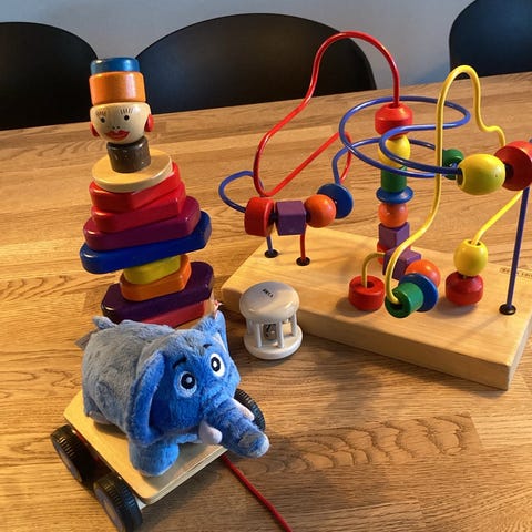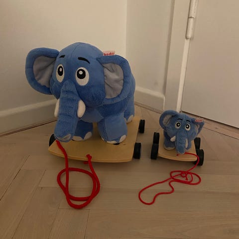 3x Bodil fra Far til Fire-filmene. De to små med plader med hjul. Den store med hjul og gyngehest-gænge. Brugsspor. Se billeder. Vi har kat. Sendes ikke. Store-Bodil er for stor