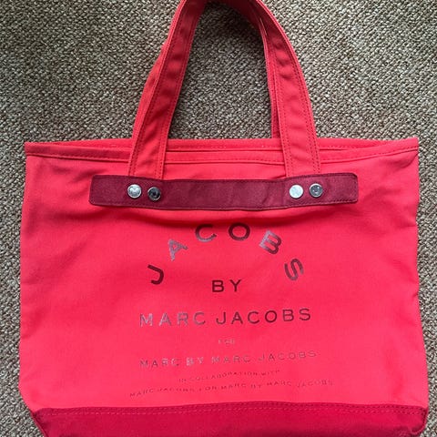 Marc Jacobs Kvinde Taske lavet af plast i lilla farve. Tasken har to skulderstropper og en rektangulær form. Dimensionerne er cirka 40 cm i højden, 35 cm i bredden og 10 cm i dybden. Tasken er egnet til daglig brug og opbevaring af personlige ejendele.