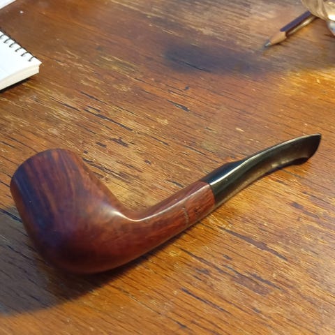 En ret anderledes tilgang til den traditionelle kalabasform, dog ikke i udførelsen, men i det keramiske materiale. Piben er fra først i 1980erne og kun lettere brugt.