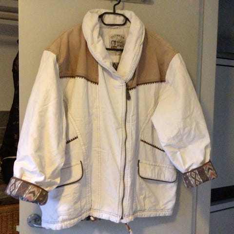 Sandfarvet damejakke med foer. 2 store lommer og 2 brystlommer. Str M. Lynlåslukning samt trykknapper. 100% bomuld. Mål: længde 61 cm, bredde over brystet 61 cm, ærmelængde 58 cm. Købt for mange år siden, men fik den kun brugt lidt.