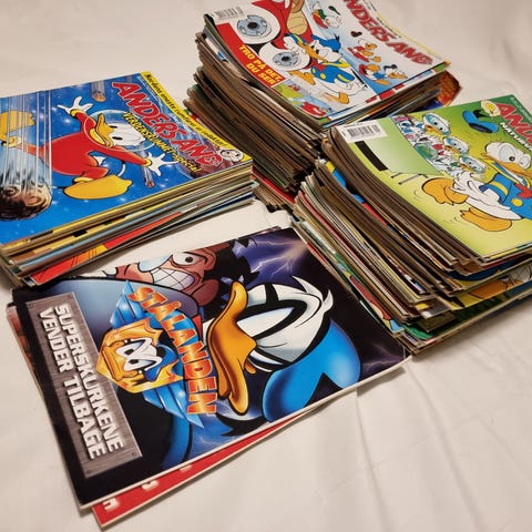 Anders And & Co Tegneserier Samling bestående af tegneserier i forskellige udgaver. Tegneserierne er samlet i flere plastkasser og indeholder klassiske historier med populære figurer som Anders And og andre Disney-karakterer. Samlingen er velegnet til samlere eller læsere af danske tegneserier.