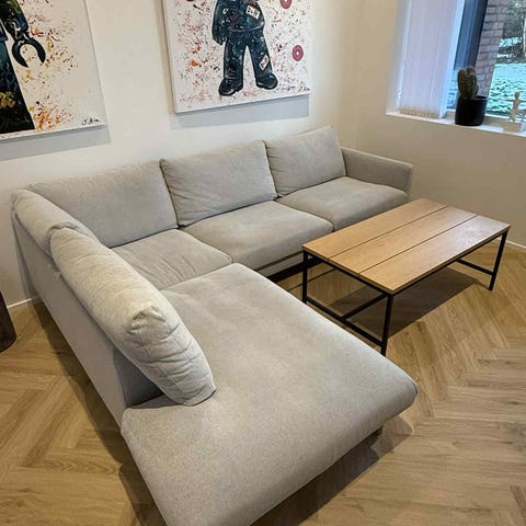 Brun velour hjørnesofa med træben. Sofaen har en L-formet opbygning med bløde sæde- og ryghynder, designet til komfort og afslapning i stuen. Materialet er velour, og benene er lavet af træ. Nakkestøtte følger ikke med.
