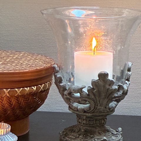 Ældre hurricane lysestage af messing og glas med ciseleringer i form af bladværk. I fin stand. Højde i alt 46 cm.
