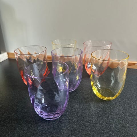 Anna Von Lipa vandglas i fem forskellige farver (confetti, lyserød, sart lilla, lysegrøn og mørkeblå). Kun brugt få gange så de er næsten som nye. Kan afhentes i Frederikssund eller på Frederiksberg. Det grønne er solgt