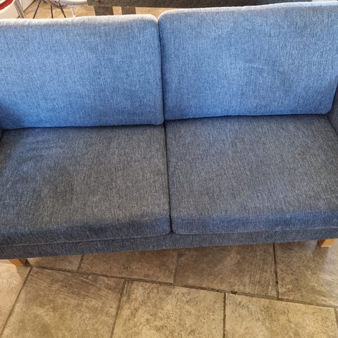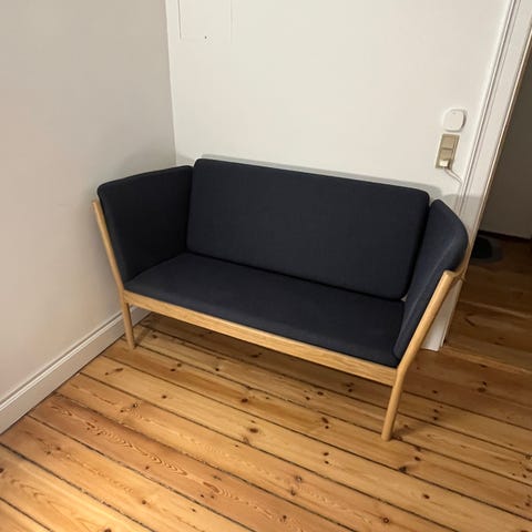 Ny sofa, stået i mellemlang og derfor brugt meget begrænset. Lækkert holdbart uldstof og ben i massiv lakeret eg. Sælges til under halv pris. Ny pris 16.000 kr.