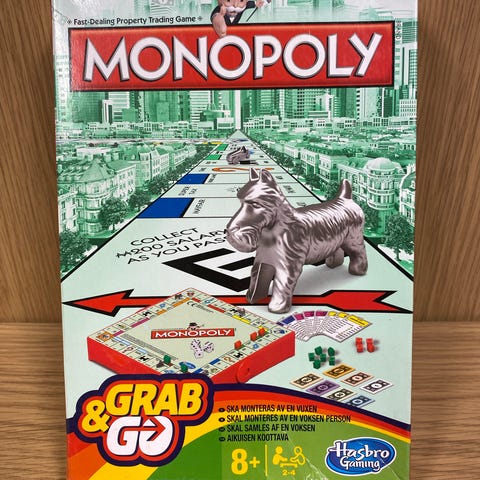 Hasbro Monopoly brætspil i standardudgave med spillebrikker, terninger og spilleplade. Spillet inkluderer ejendomskort, pengesedler og hus- og hotelbrikker. Velegnet til flere spillere og familier, fremstillet af pap og plastikmaterialer.