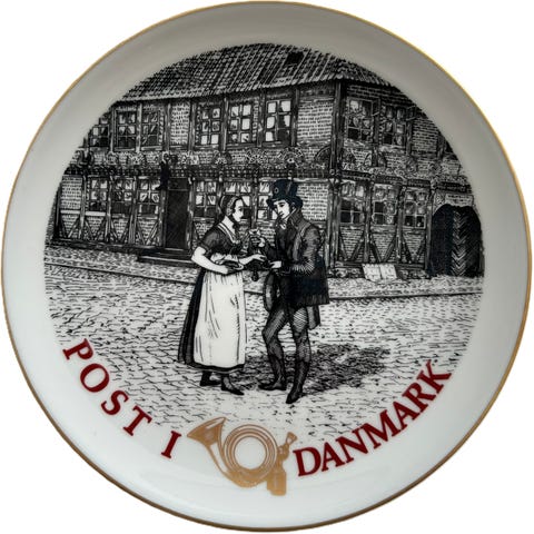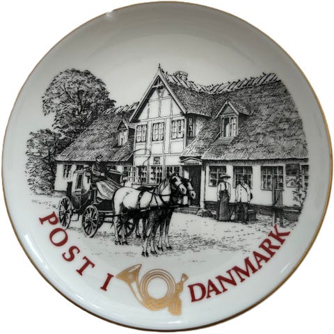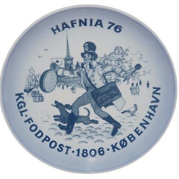 Flot blå platte fra Bing & Grøndahl med motiv fra Hafnia 76 - Kgl. Fodpost - 1806 - København.