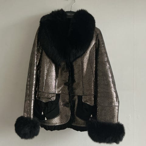 Sort skøn 3/4 lang rulamspels med hætte og 2 lommer. Der er pelskanter og for i jakken. Den lukkes med bindebånd og knapper.