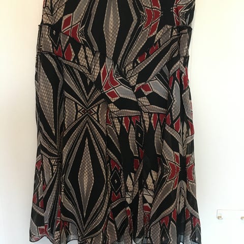 Les Copains nederdel i sort farve, størrelse 52, men bemærk det er italiensk mål, bedøm selv størrelse ud fra, at taljemålet er cirka 96 cm og længden cirka 69 cm ( størrelse 44? ) Nederdelen har synlig lynlås bagpå som er cirka 19 cm og elastisk taljebånd bagpå for bedre pasform se billede 3. På billede 4 vises overgangen til det elastiske taljebånd ved sidesømmen. Materialet er 48% bomuld, 45% polyamid og 7% elastan, medens foret er fremstillet af 68% acetat og 32% polyester. Designet er enkelt og klassisk og der er bagpå en slids på cirka 29 cm men slidsen åbner ikke så meget for nederdelens stofdele går over hinanden. Blusen medfølger ikke.