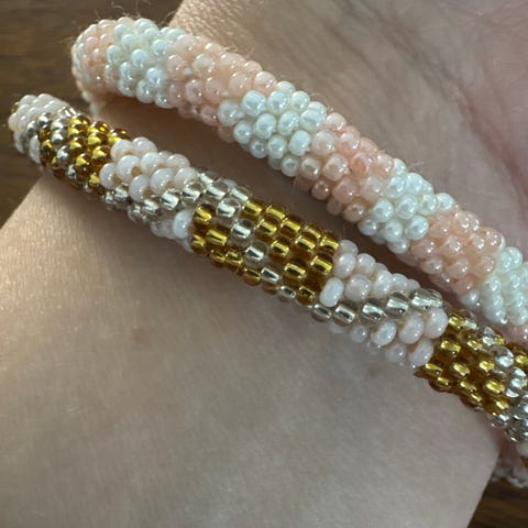 2 fine armbånde i perler fra Søstrene Grene. Den ene er med grønne perler og den anden med rosabrune farver. Sælges samlet.