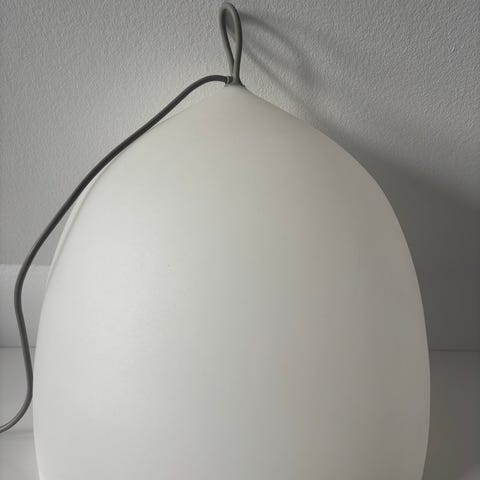Lampen er i hvid plast (polyethylen) med rød stofledning og stik.