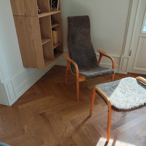 Designklassiker hvilestol ved navnet, Laminett, en lillebror til Lamino, tegnet af Yngve Ekström og produceret af Swedese. Stel af lakeret bøgetræ, sæde og ryg betrukket med brunt fåreskind (espresso). Højde: 80 cm, bredde: 70 cm, dybde: 70 cm, siddehøjde: 41 cm.