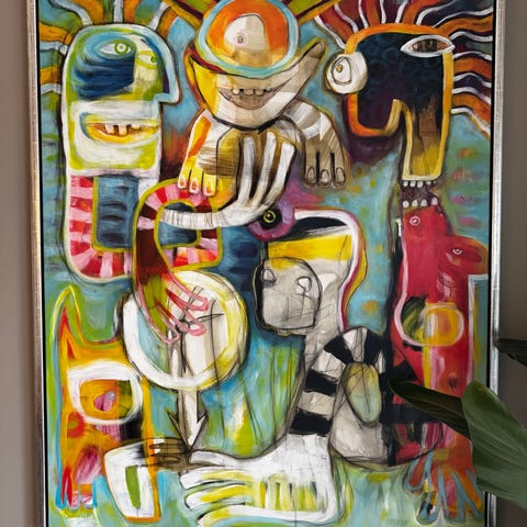 Farverigt og finurligt originalmaleri af Bodil Schaldemose – 'Collage maleri'