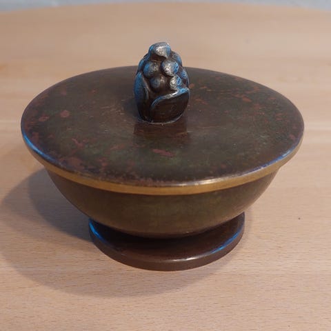 Stor lågskål i bronze med virkelig flot patinering. Højde: 9,5 cm. Diameter: 18 cm. Fremstår med lidt skrammer og ridser, men ellers i ganske udemærket stand.