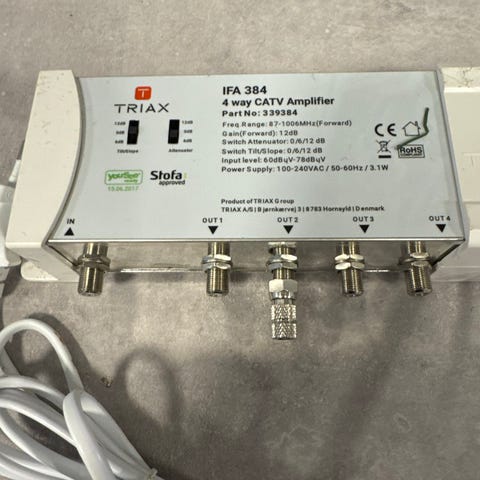 1 indgående og 4 udgående F-connectorer (hunstik).
