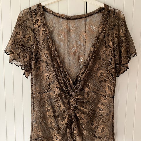 Blonde bluse med fine detaljer. Str. M. Aldrig brugt. Farven er gylden og med indvævede sorte tråde. Nylon. Den viste, sorte top indenunder (foto 5) hører ikke til blusen, men kan sagtens følge med u/b.
