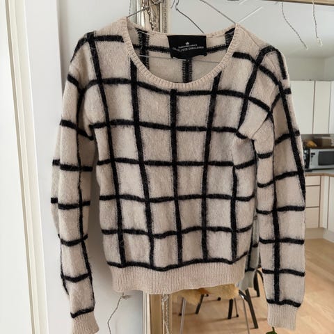 Mærke er klippet ud. Blødt materiale og sikker på, at det er noget acryl mix med stretch