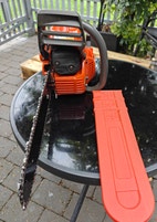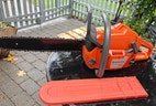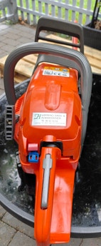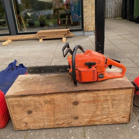 Saven er rengjort og nyserviceret, med nyt tændrør, ny afbryderkontakt, og ny membran/pakninger i karburatoren. Den starter og kører som den skal 🙂