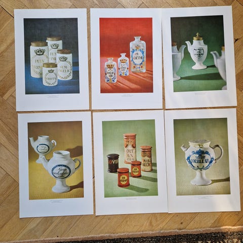 Sæt med 6 flotte kunsttryk (20 x 30 cm) med motiver af gamle apotekerkrukker og karafler fra Københavns Bymuseums medicinske samling.