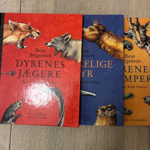 “Dyrenes familieliv” af Bent Jørgensen. “Denne bog fortæller om nogle af de mange forskellige dyreunger og deres forældre. Den fortæller bl.a. om de unger, der bliver passet af deres forældre til de bliver store og om de unger, der må passe sig selv, fra de er helt små. Illustreret af Birde Poulsen, som vandt Kulturministeriets Illustratorpris 1998 for tre af sine bøger, deriblandt Mærkelige dyr, der også er lavet sammen med Bent Jørgensen.” Hardback udgivet af Gyldendal i 2009. Udsolgt fra forlaget. Fin stand!