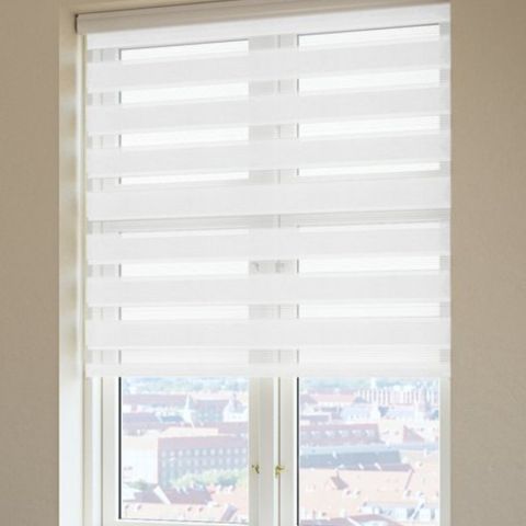 6 stk. hvide kassette duo rullegardiner med fin tungekant (denne kan afmonteres). Polyester. To lag af transparente og lukkede striber giver mulighed for at lukke lidt lys ind eller skærme helt af. Med kædetræk