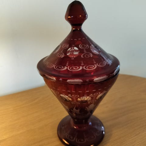 Bøhmisk bonbon skål i krystal glas og med med fugle i relief på 3 fod diam. 13,5 cm