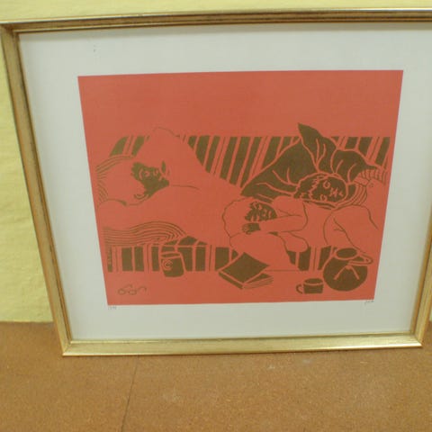 Sort/hvid kunsttryk, viser en gruppe mennesker i samtale i et indendørs miljø. Illustration med detaljeret skildring af personer og interiør. Passer til vægophæng som dekorativt element. Gamlet billede plakat ? 50 kr