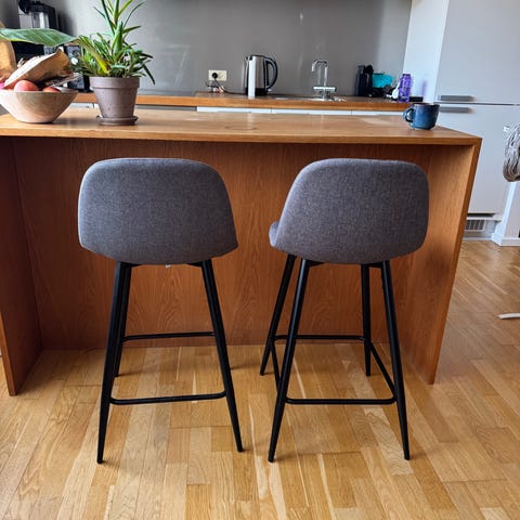 Used for just over a year, in really good condition. We moved to a new place and have no use for them. Bar stool/high chair with PU leather seat, wooden frame and rattan back.