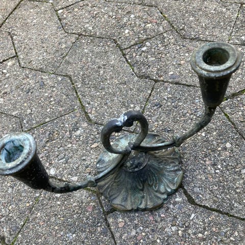 Lille fin tre-armet lysestage lavet af gamle 2-ører og 5-ører med en kande i midten, til små lys. 10x12cn