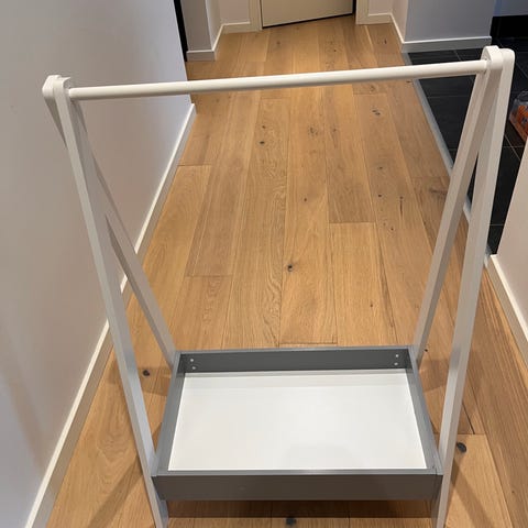 Børnehus Tøjstativ i træ med husformet ramme og tøjstang. Designet til børneværelser til opbevaring og organisering af børnetøj. Fremstillet i lyst træmateriale med naturligt finish. Lavede af en snedker. Pris sat efter stand