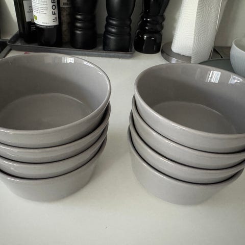 H&M Home keramik spisesæt bestående af tallerken, mindre tallerken og skål i grå farve med sort mønster. Sættet er lavet af keramik og egnet til daglig brug i køkkenet.