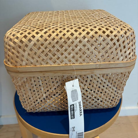 IKEA flettet kurv med låg, lavet af naturlige materialer. Kurven er rund og har en lukkelig låg, egnet til opbevaring af små genstande. Farven er naturlig brun, og kurven har en håndlavet struktur.
