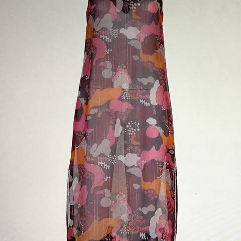 Elegant eksklusiv silkekjole fra Heartmade by Julie Fagerholt. Str 32. Spænende snit med spids foran. Sort bund med elegant print. Rund krave med slids. Aftageligt bindebælte. Ca mål bryst og talje 84cm, længde med spids 130cm.