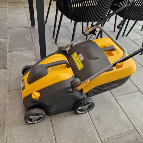 Der mangler stof på opsamleren med metalrammen er med. Brug evt. din plæneklipper som opsamler istedet - det er meget bedre og mere effektivt!