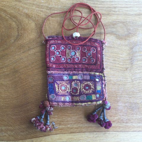 Smuk og farverig håndlavet taske fra Kenya. Original sisal taske design, men lavet af genanvendt plastic. Pande-rem i naturmaterialer (tasken bæres oprindeligt med hovedet og ikke på skulderen.)